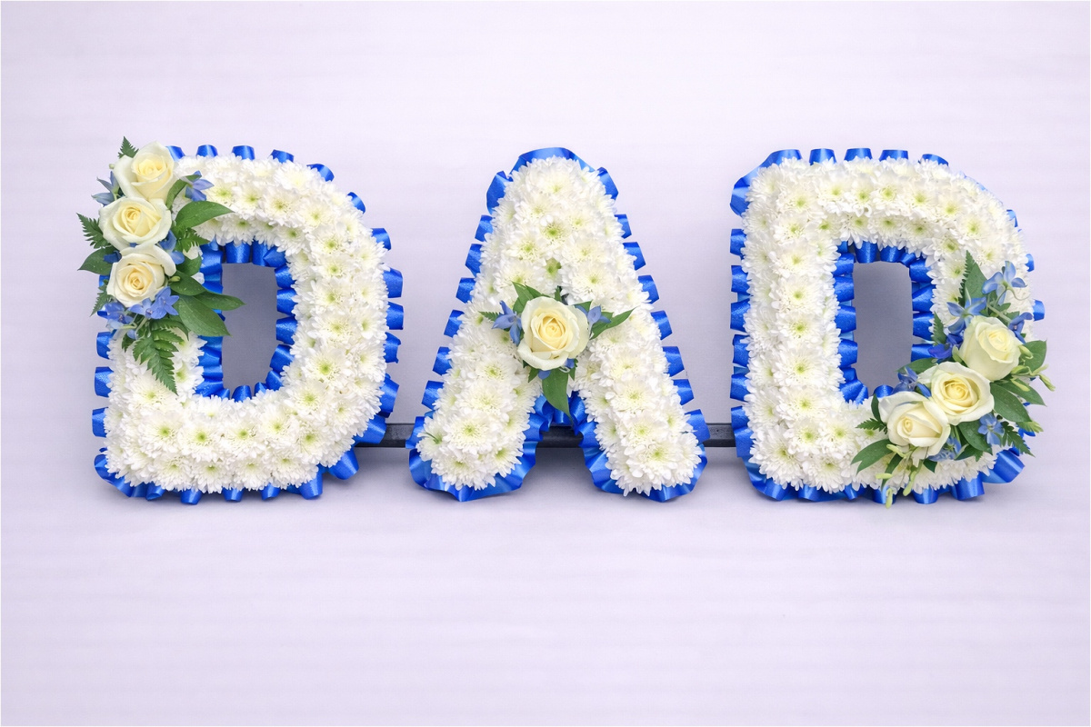 Beautiful white Chrysanthemums with a flourish of floral to match your ribbon choice edged with  ribbon pleats, form the name DAD.